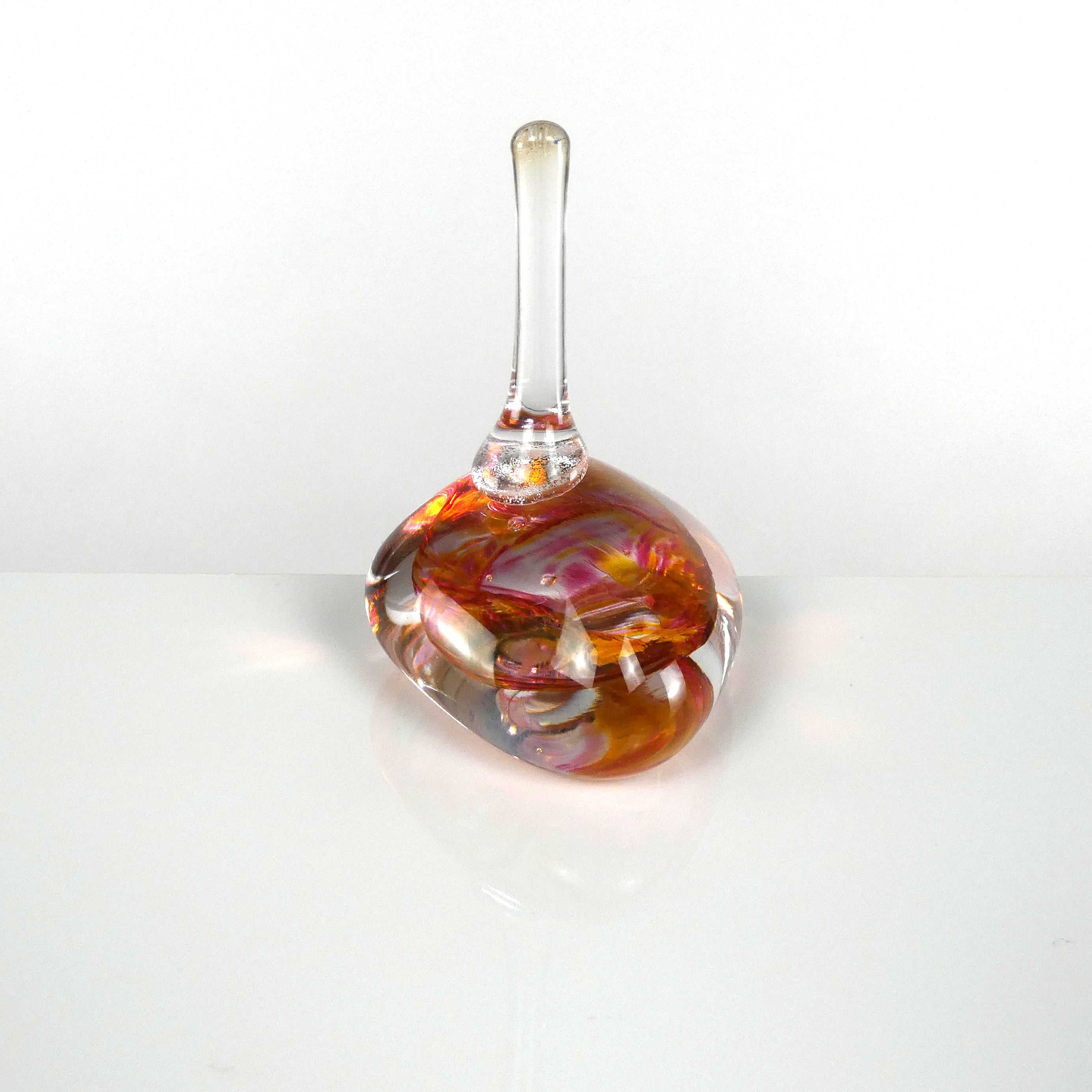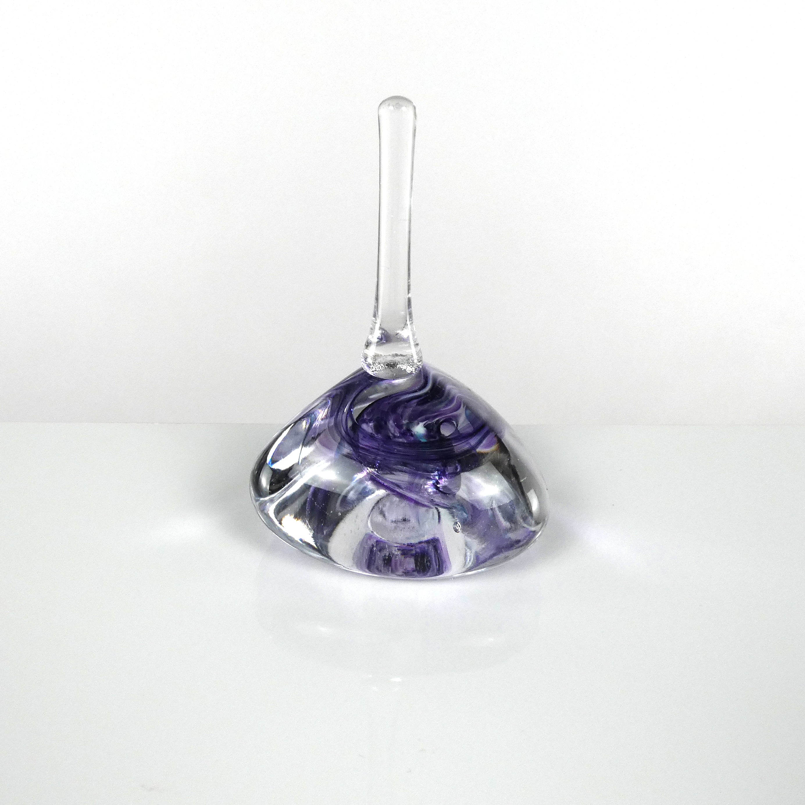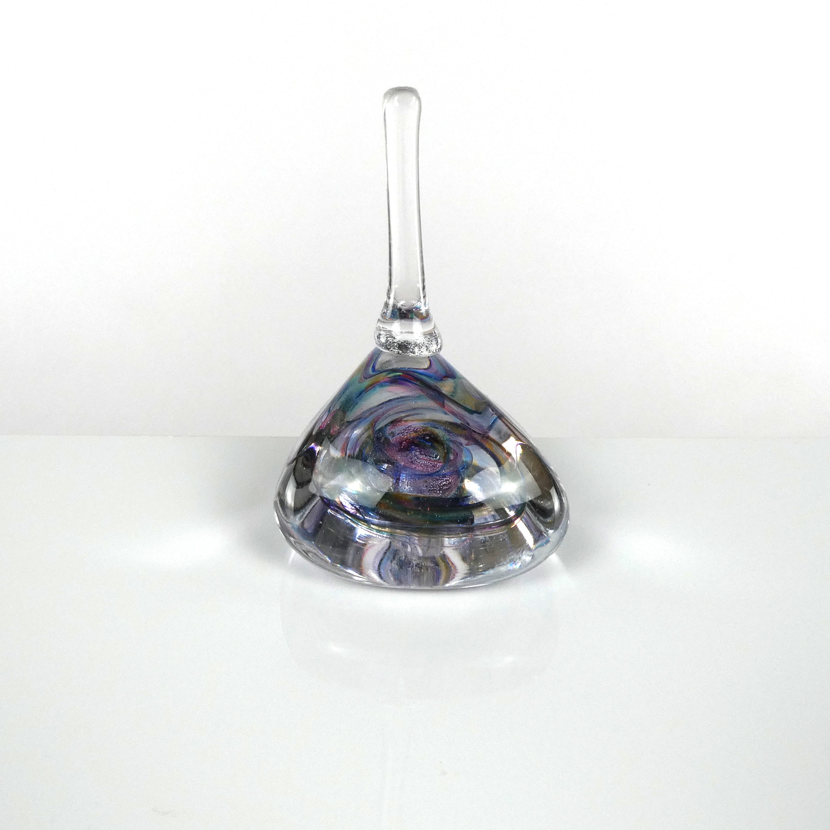 Our ring holders are perfect next to the kitchen or bathroom sink, or any place you might take off a treasured ring. Slip it onto this ring holder for safe keeping while you're doing dishes, washing your hands or sleeping. You'll always remember where you put it. They have a soft three-sided shape, like our Moonstone paperweights, with swirls of color on the inside. They stand about 4" tall, and the base is about 3" across.