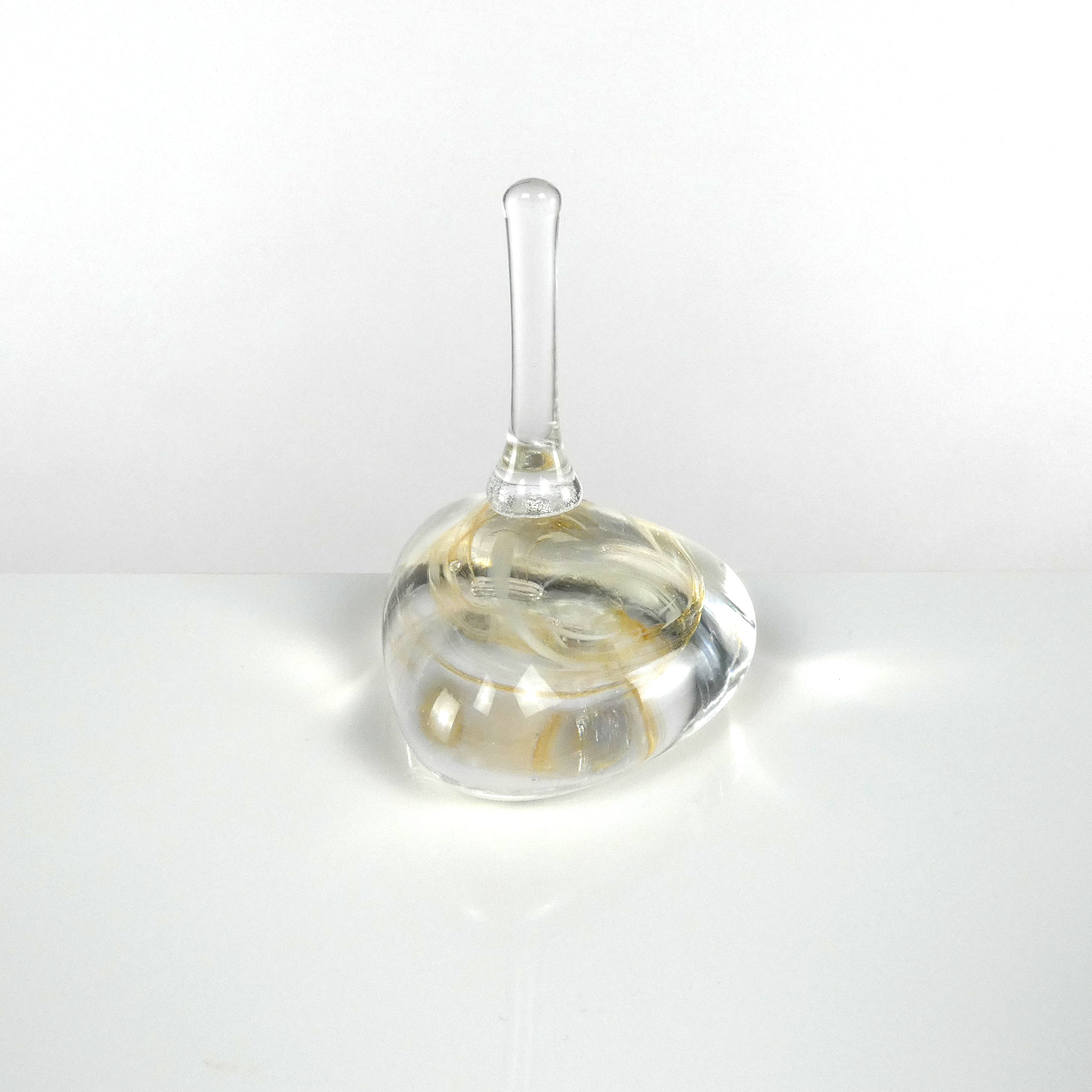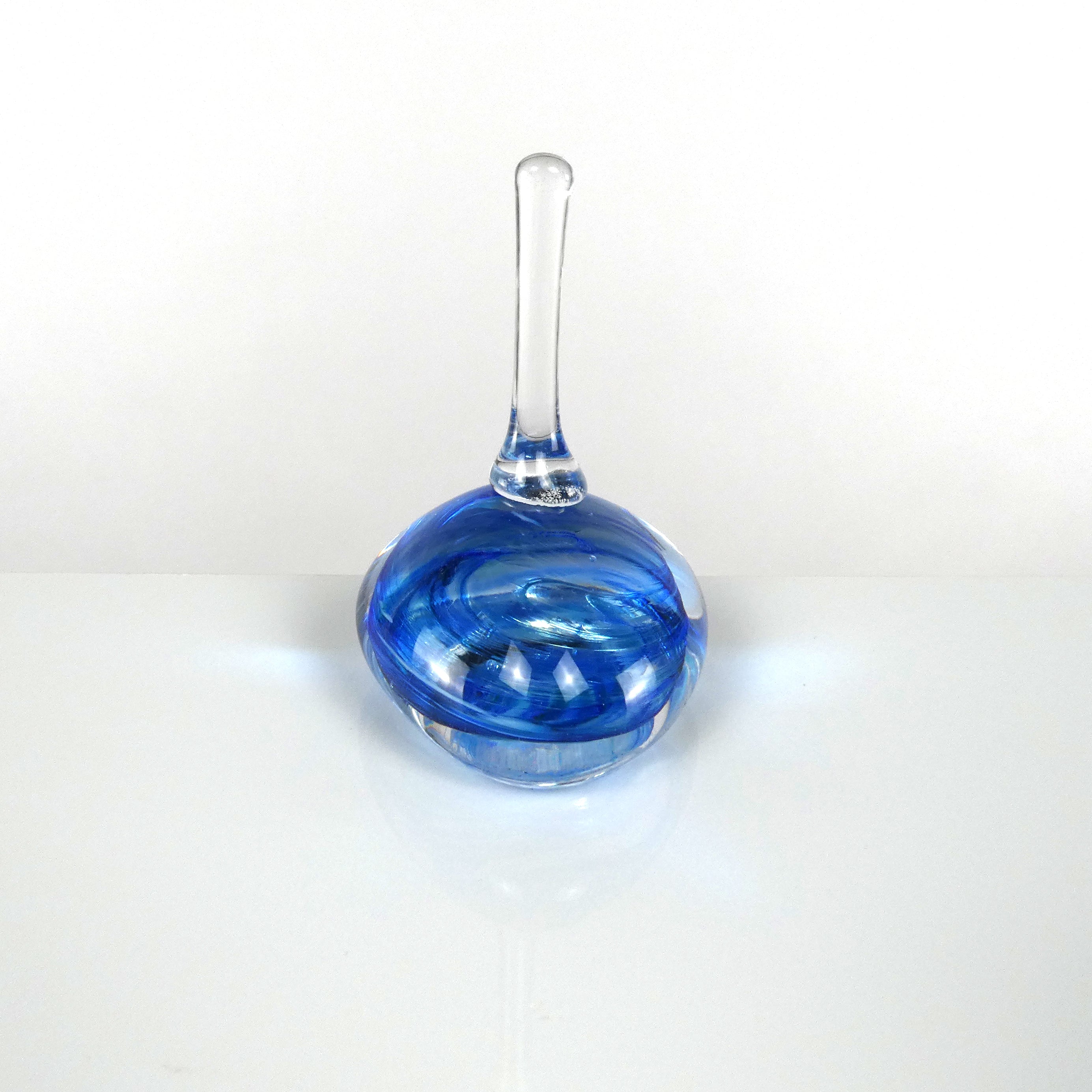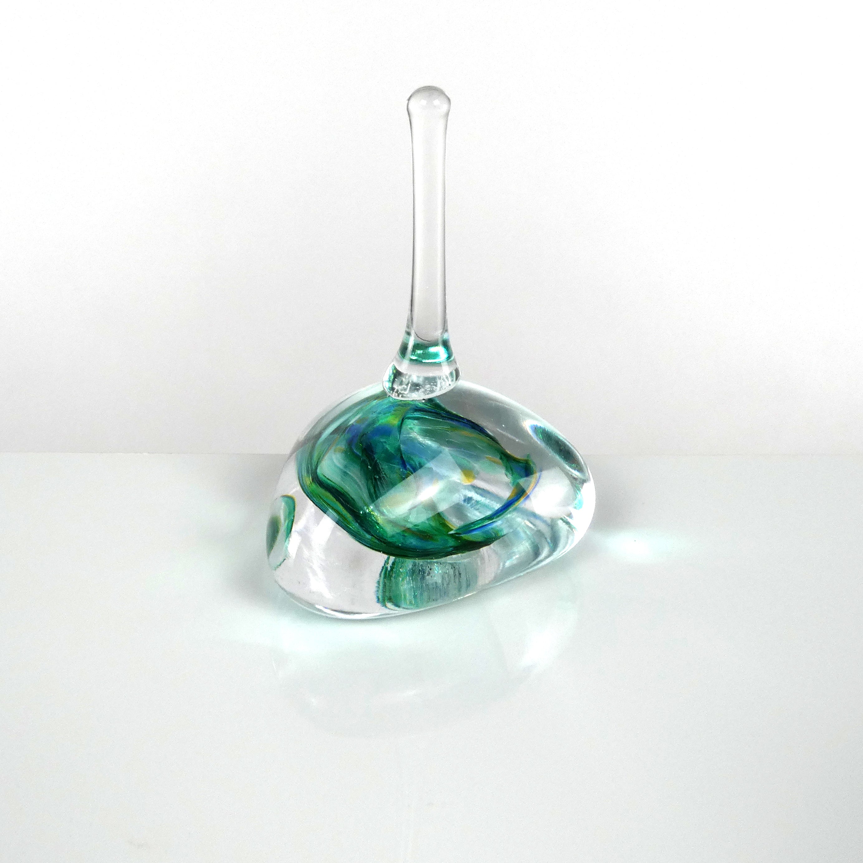 Our ring holders are perfect next to the kitchen or bathroom sink, or any place you might take off a treasured ring. Slip it onto this ring holder for safe keeping while you're doing dishes, washing your hands or sleeping. You'll always remember where you put it. They have a soft three-sided shape, like our Moonstone paperweights, with swirls of color on the inside. They stand about 4" tall, and the base is about 3" across.