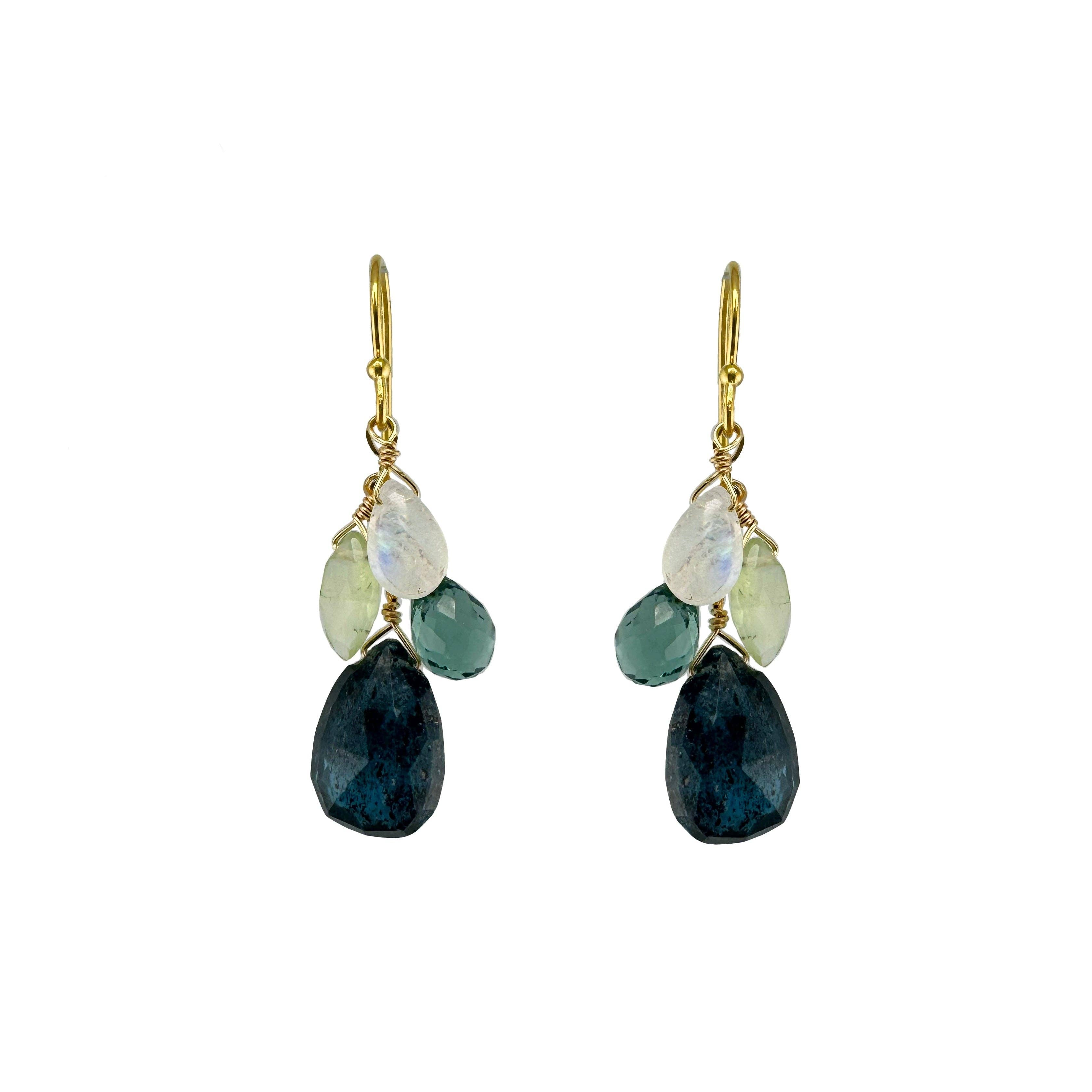 Kyanite, prehnite, quartz, & moonstone cluster earrings in silver or vermeil. Earrings hang approx. 1 1/2" long. Item# 187-06se/ve. Our vermeil is sterling silver dipped in 16k gold. Findings are sterling silver and 14k gold fill. Handmade in Oakland, CA • hangs 1 1/4” • vermeil, gold fill, silver • green kyanite, prehnite, quartz, moonstone • handmade in Oakland, CA