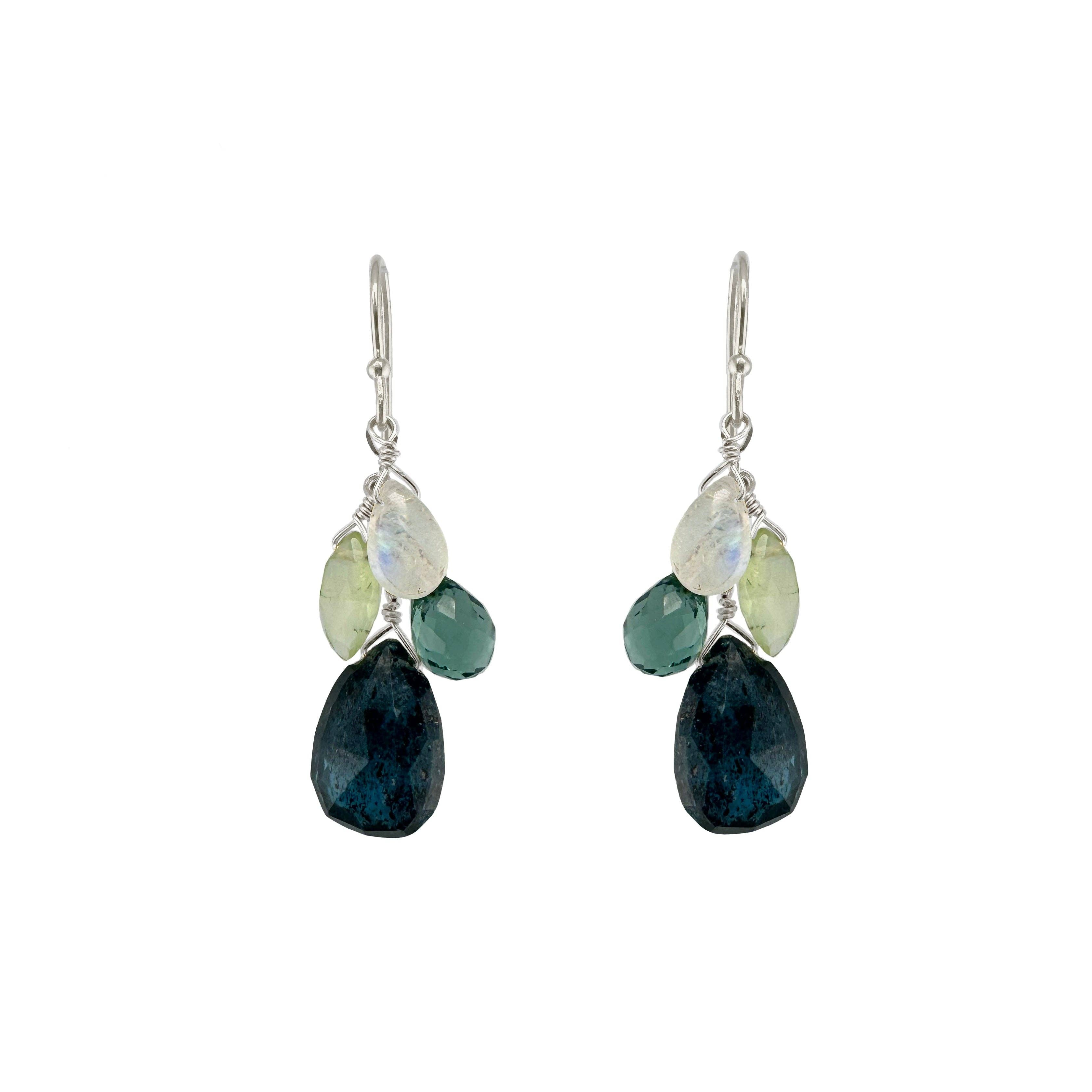 Kyanite, Prehnite, Quartz, & Moonstone Cluster Earrings: Silver