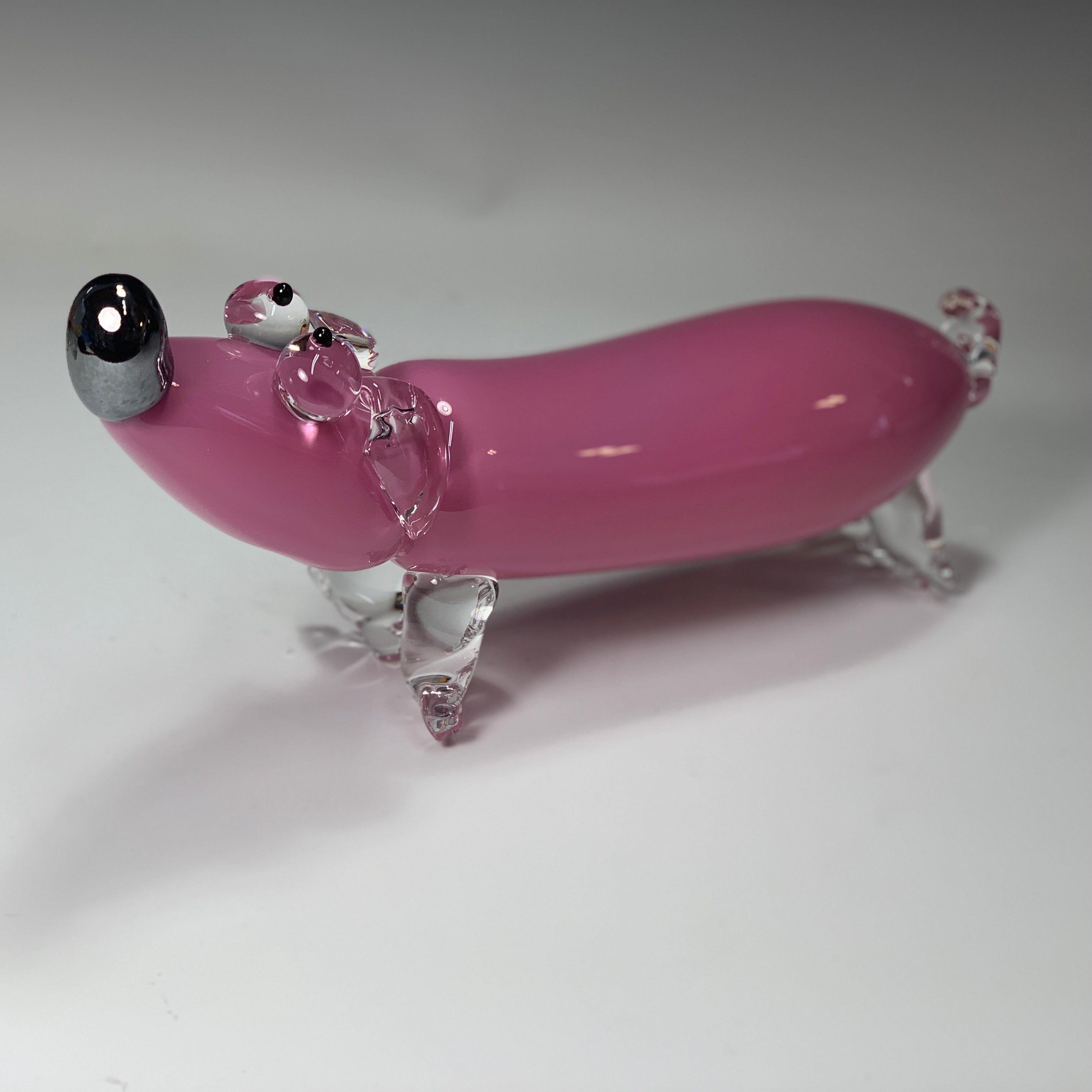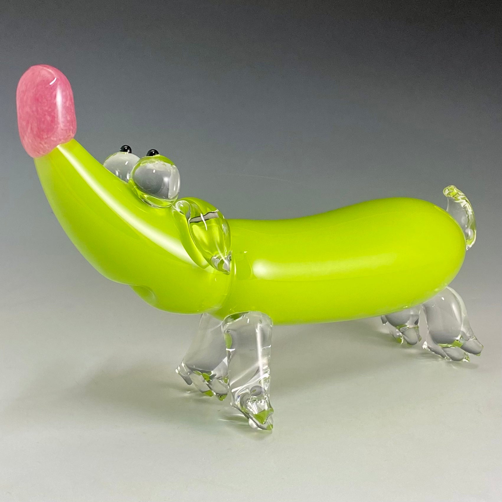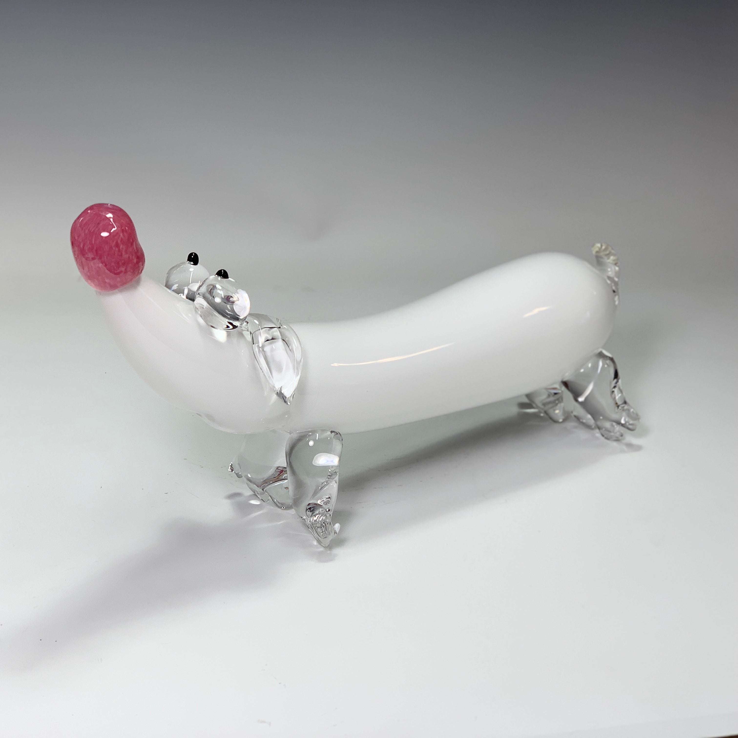 Handblown by Catherine Labonte, this whimsical weiner dog measures 7.5" x 3.5" x 12".