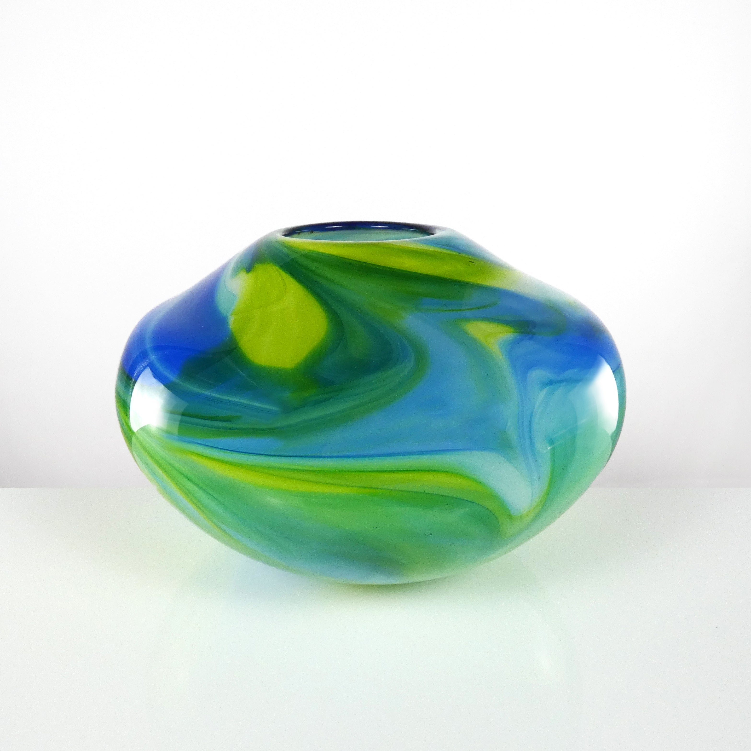 Part of the Tidewater Series, this vase is an entirely unique one-off piece, created with in the Glass Station's "Springtide" colorway. While its siblings in the series call to mind cool mists over a calm sea, the Springtide Low Vase invokes the greens, yellows, and swirling blues of the salt marsh.