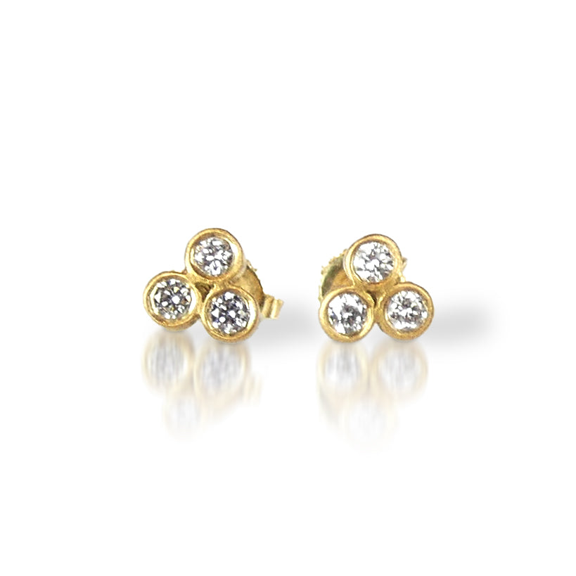 Marian Maurer's Triple Diamond Studs are an artistic twist on the timeless diamond stud earring. Three 2pt diamonds are bezel set in each handcrafted 18 karat gold earring, adding unique and refined sparkle to your look. These versatile studs are perfect as delicate everyday earrings, refined accents to an otherwise bold style, or beautiful adornments in nontraditional ear piercings.