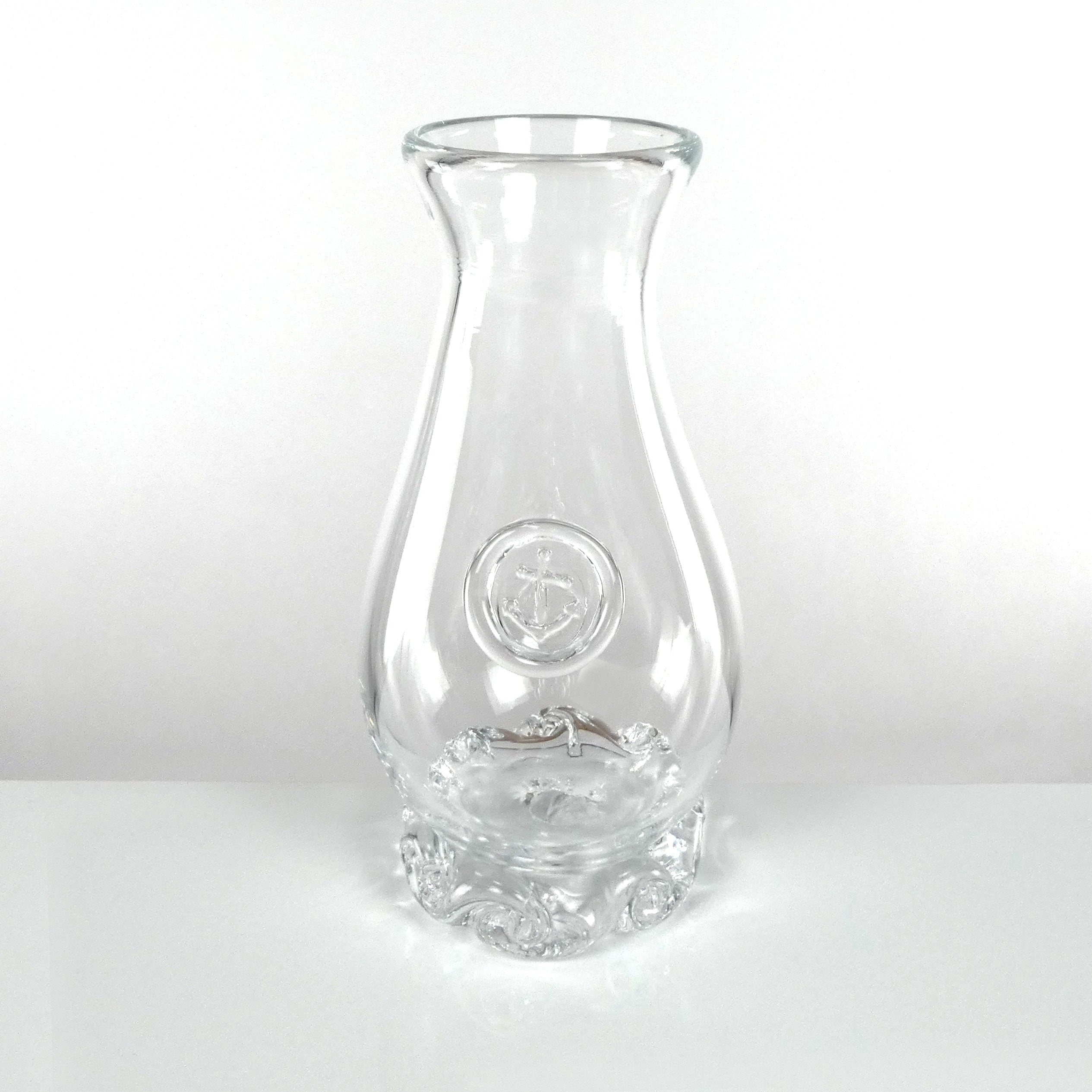 The ideal compliment to a set of our Ship's Whiskey Glasses, this decanter will hold your favorite beverage in perfect nautical style. It also makes a perfect vase for flowers. Decanters stand about 10" tall and have a heavy wavy foot for stability. Choose Block Island or an anchor stamp.
