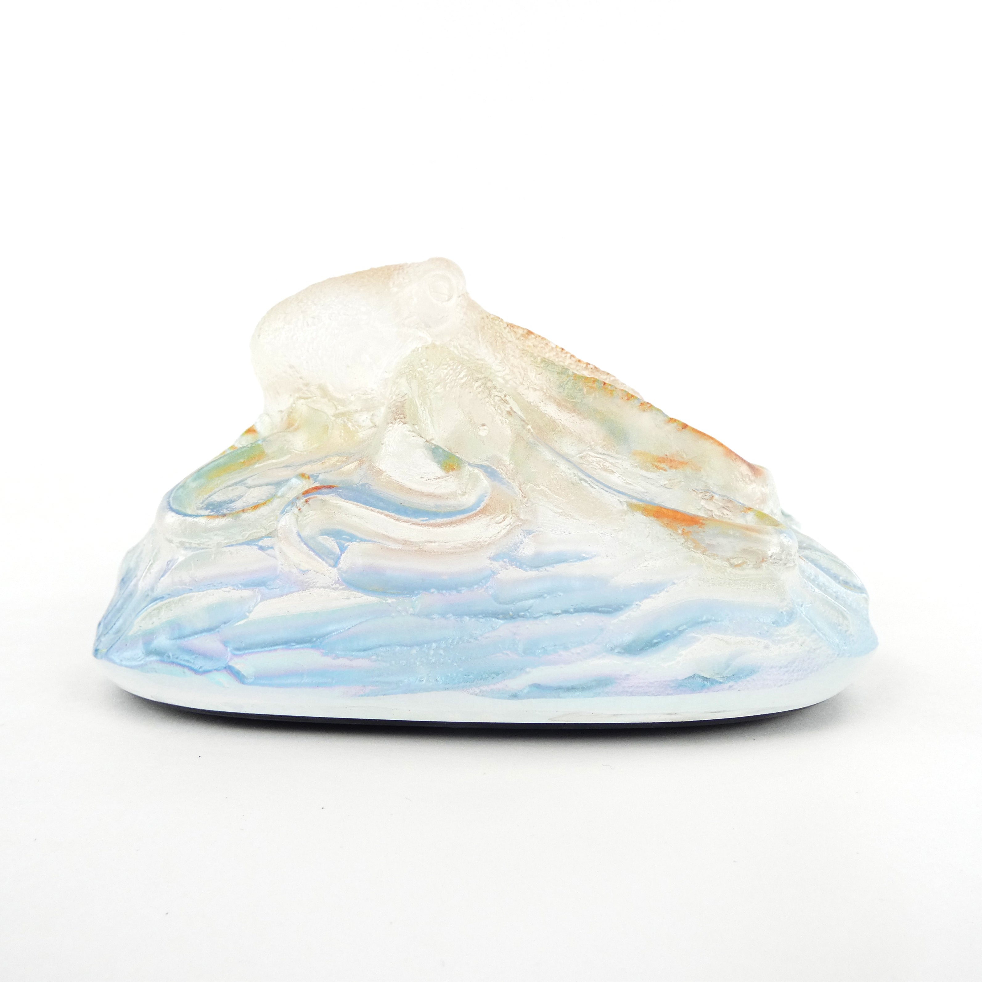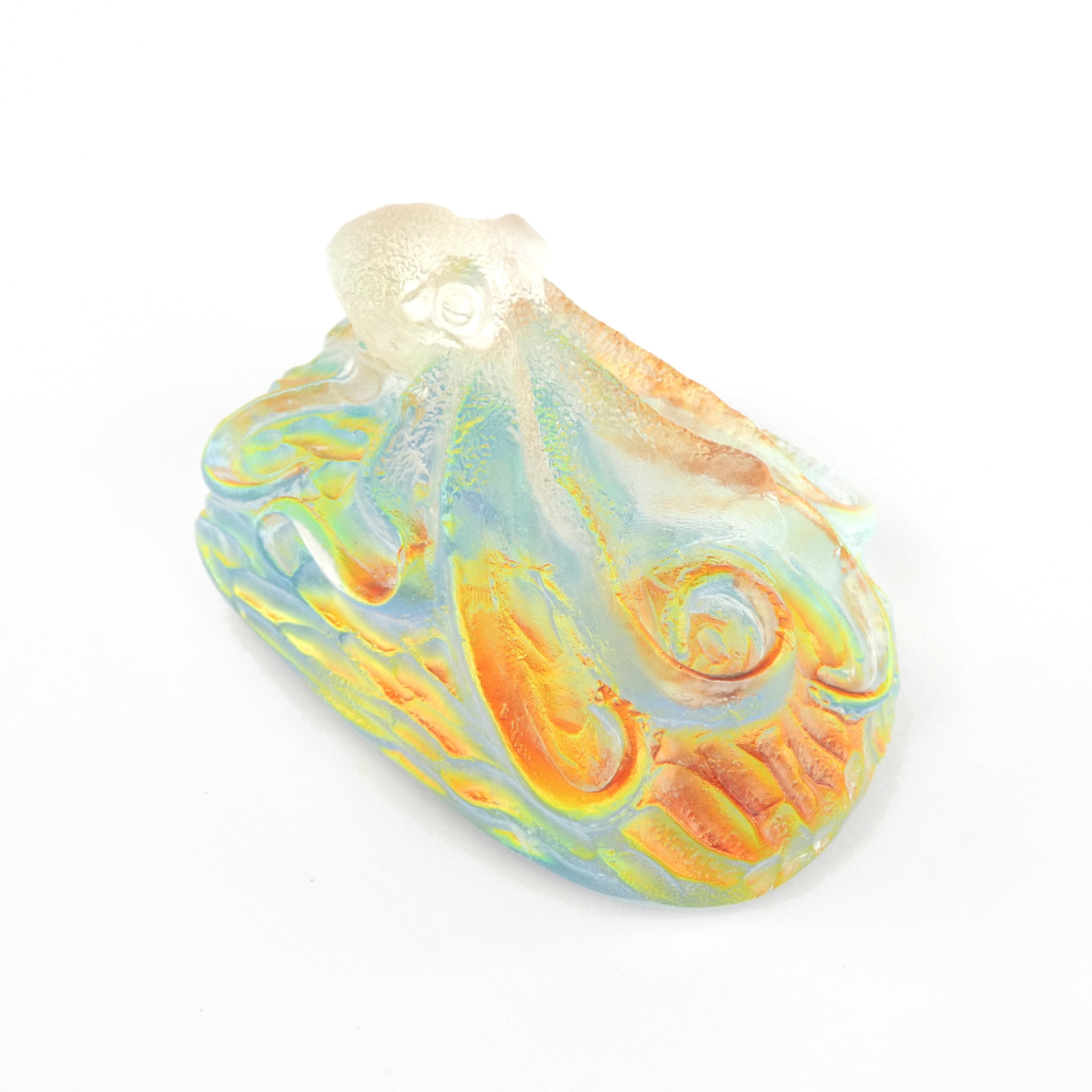 The dichroic glass used in Aural Sunset Octopus reflects a spectrum of red and yellow hues throughout its form, shifting into blues in more extreme light.