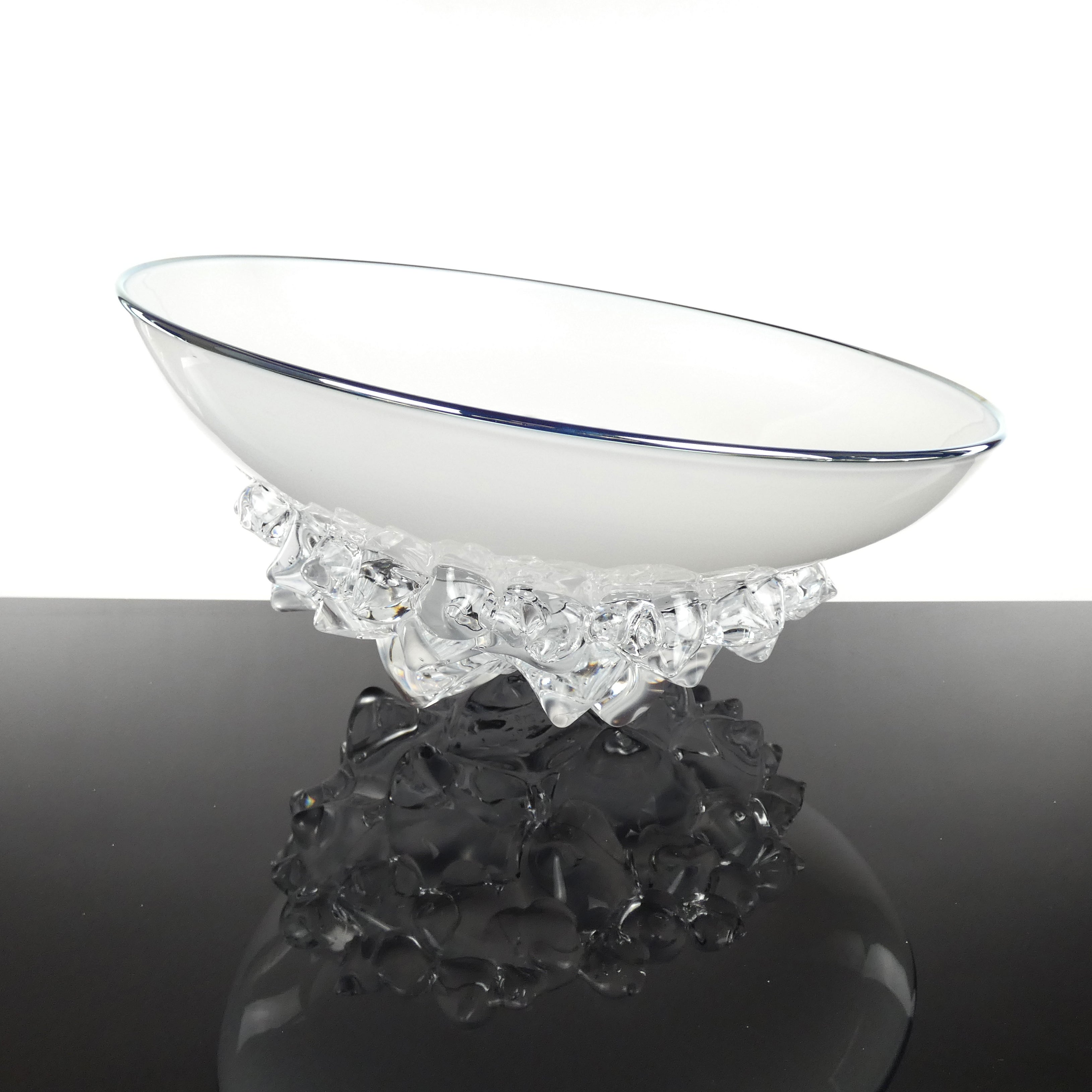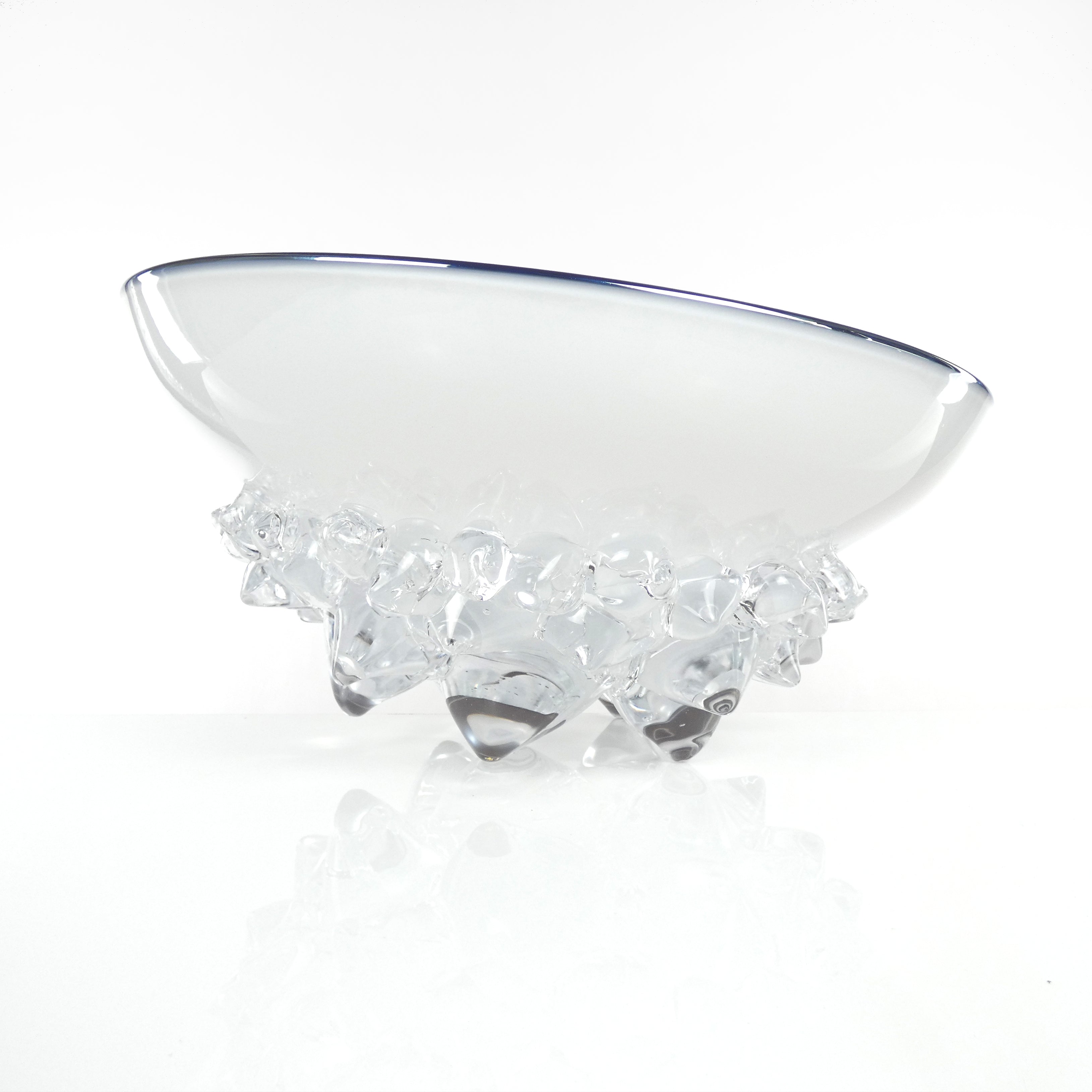 Madvin's Thorn series exists in tension, perfectly balanced though appearing on edge. A constellation of clear, sculpted glass thorns supports the delicate blown glass form, allowing it to rest at dynamically shifting angles. Each work is a sculptural meditation on balance, fragility, and strength—an extraordinary piece for collectors and admirers of contemporary glass.