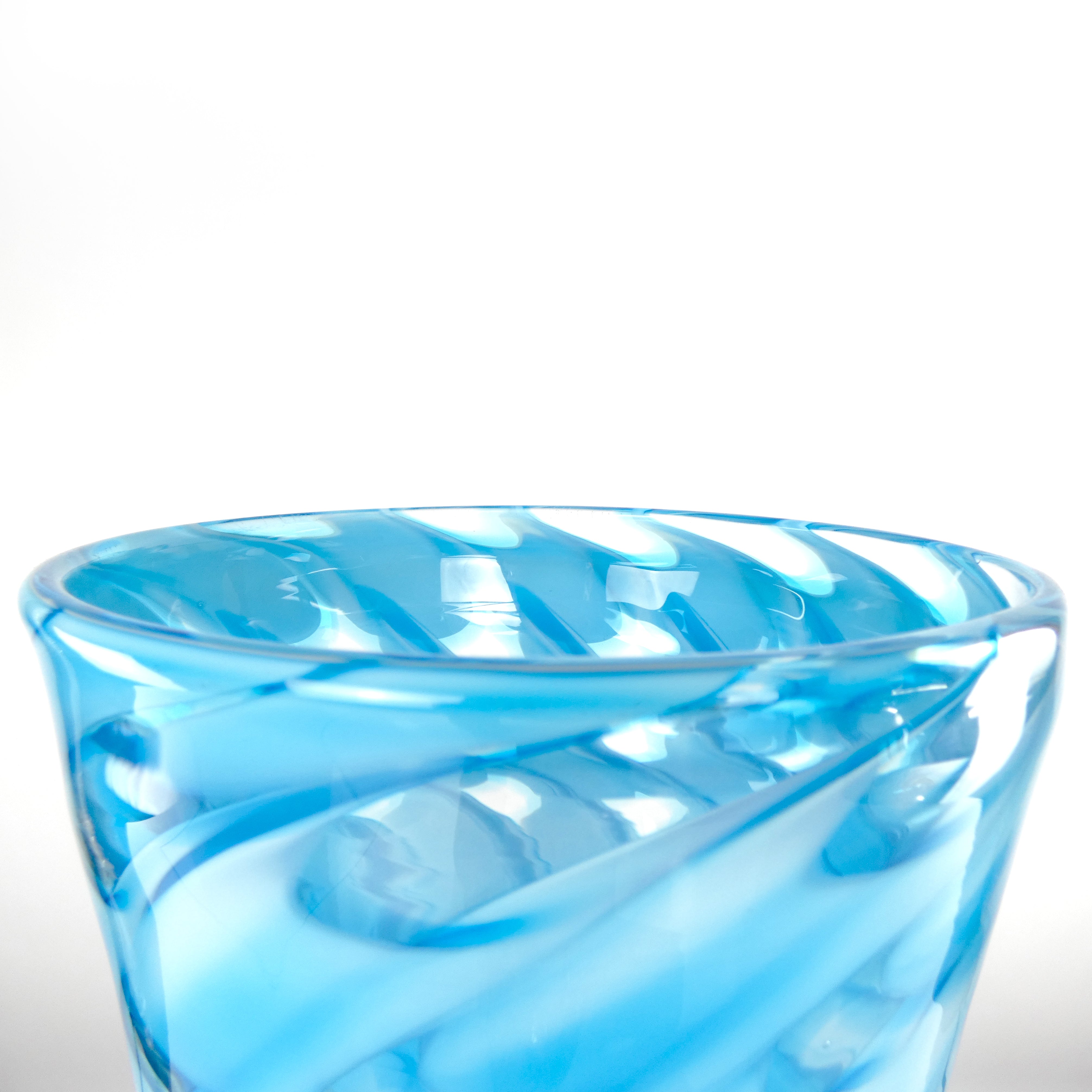 Like clouds passing through a summer sky, white glass and copper blue color are layered and manipulated to create a soft texture on this vase. Display it empty or fill it with a substantial bouquet of flowers to really make a statement. It measures 14" tall x 8" wide at the top.