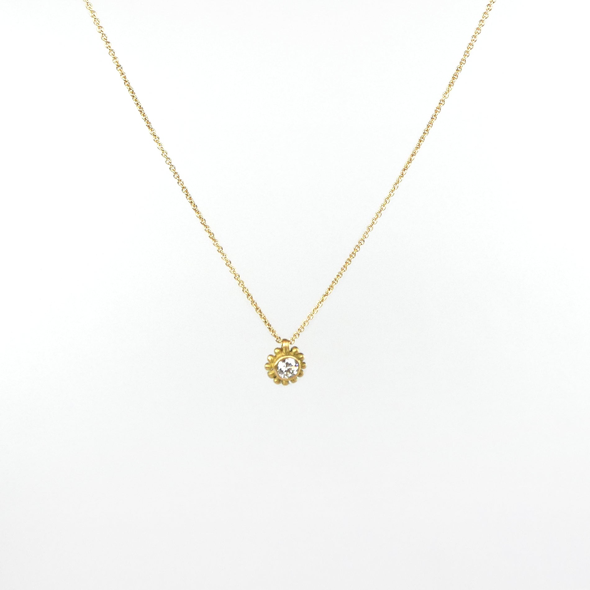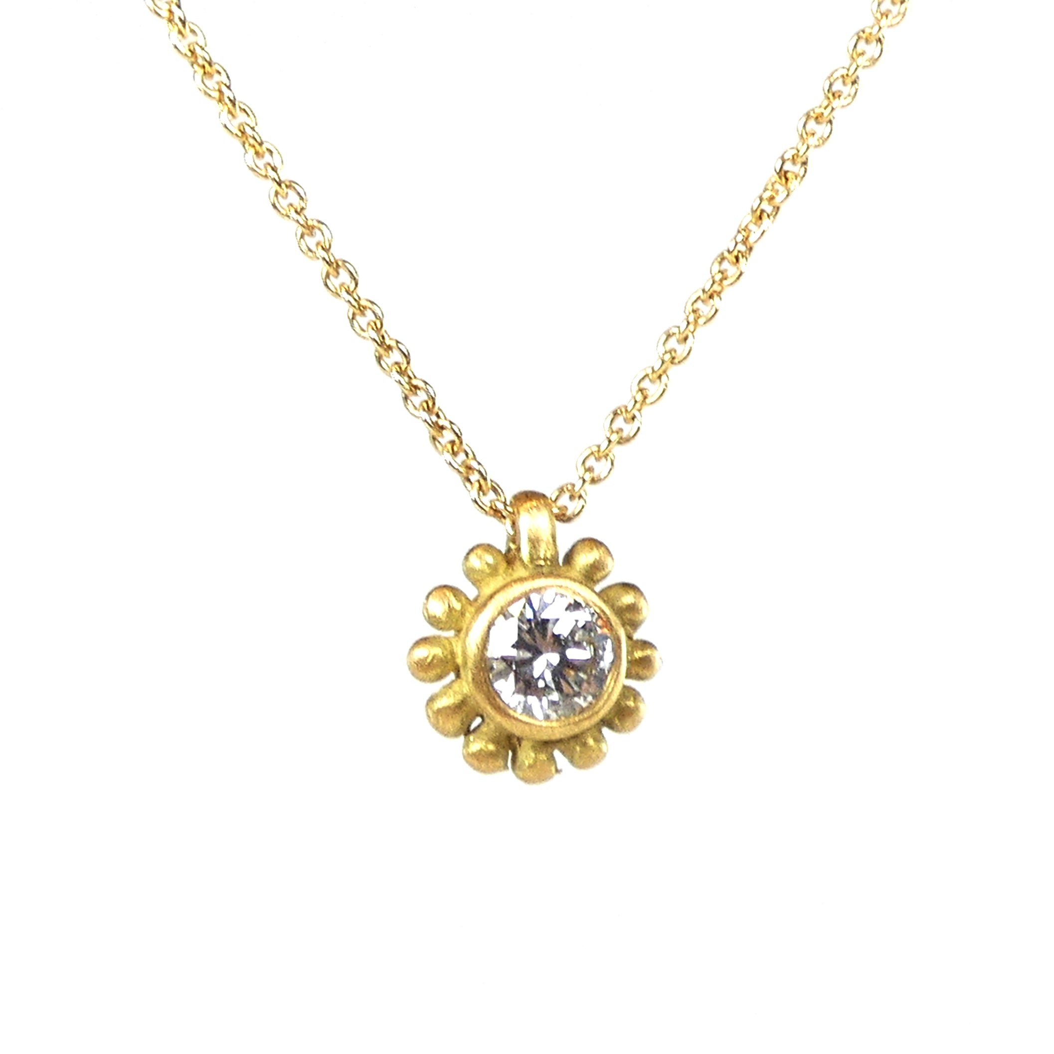 Marian Maurer's Palace Pendant Necklaces feature diamonds stones in exquisitely crafted sunburst pendants that burn with light. This necklace features a 10pt diamond bezel set in a handcrafted pendant on a 16" cable chain, all in 18 karat gold.