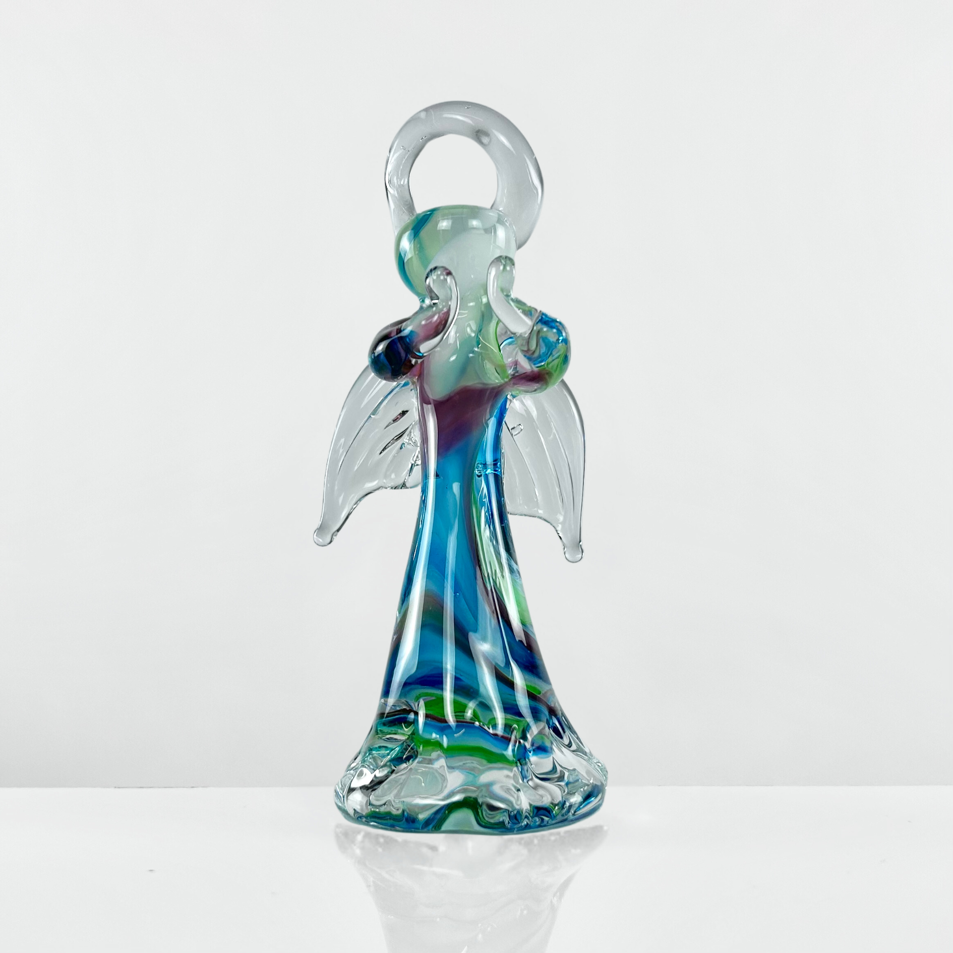 Hand-crafted by the artists of 3 Crow Glass Studio, this 4.5" glass angel ornament carries a quiet glow all its own. Each figure is shaped by hand, with soft, swirling ribbons of color suspended within the glass—no two patterns ever the same. Delicate yet full of presence, it catches light beautifully on the tree, in a window, or anywhere you’d like to add a touch of holiday grace. A thoughtful gift or a keepsake to cherish year after year.