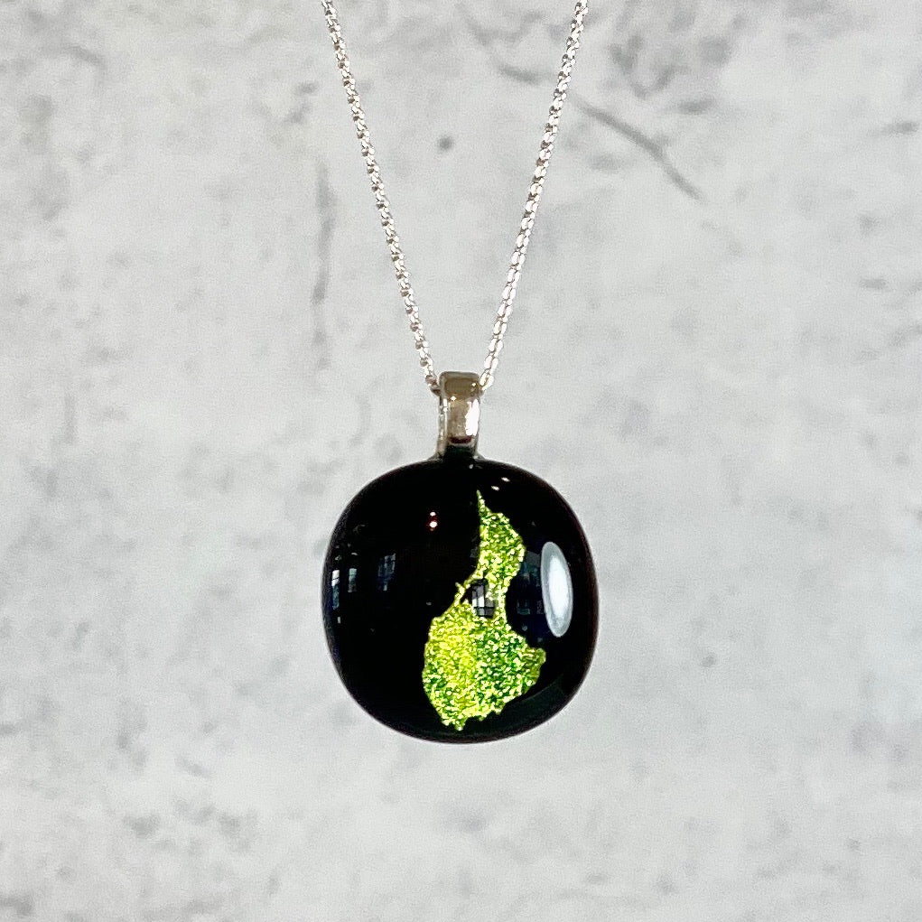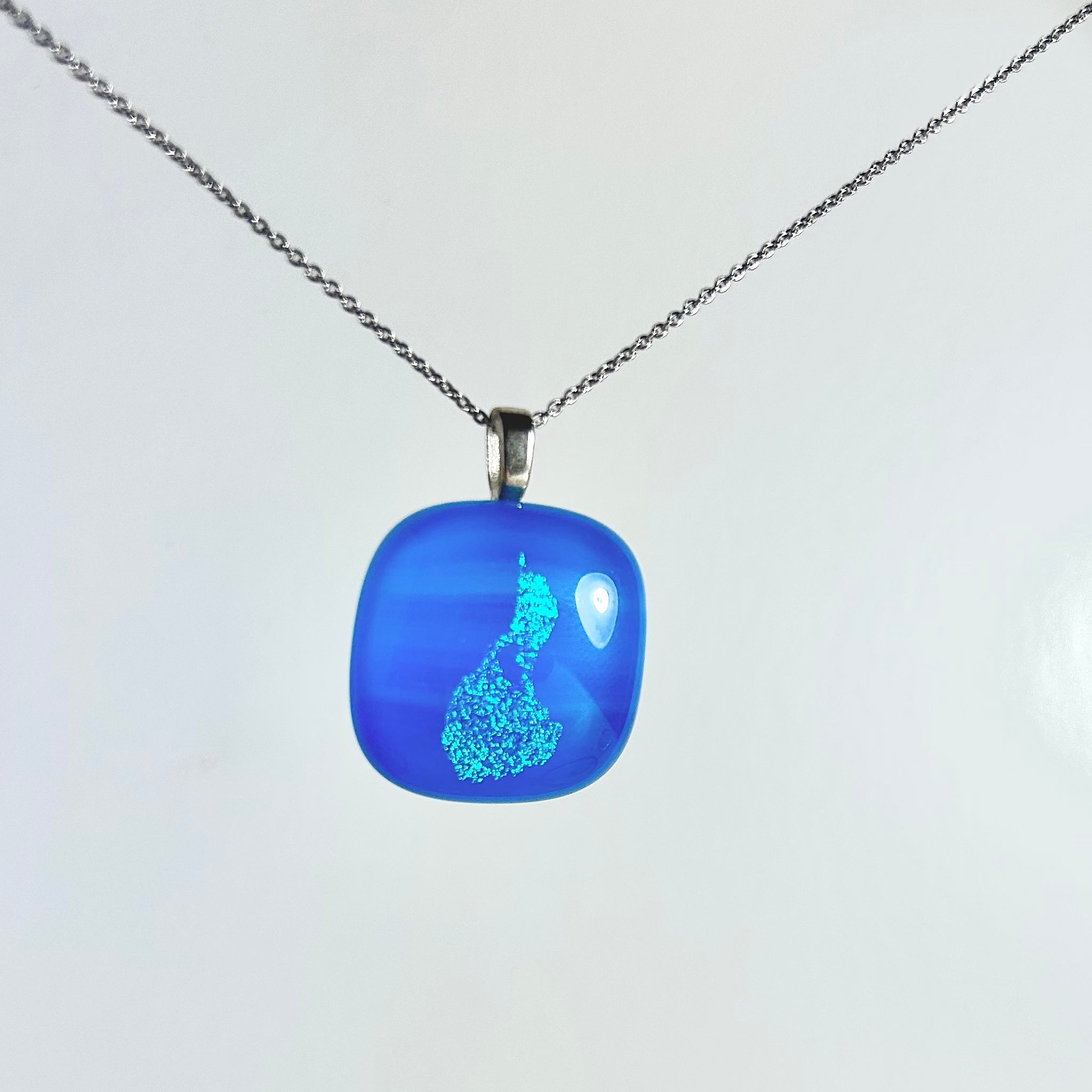 Our “Dichroic Glass Block Island Necklace” features a dichroic glass pendant in various colors with the Block Island silhouette in sparkling green. Pendant sits on a sterling silver chain measuring 18”. Made at the Glass Station by Eben Horton.
