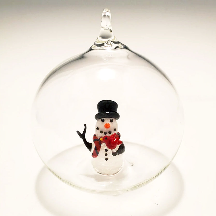 These adorable snowman ornaments are flame worked and captured in a hand blown bubble ornament. Scarves and birds come in two colors, blue and red. They are perfect for your winter seasonal display!