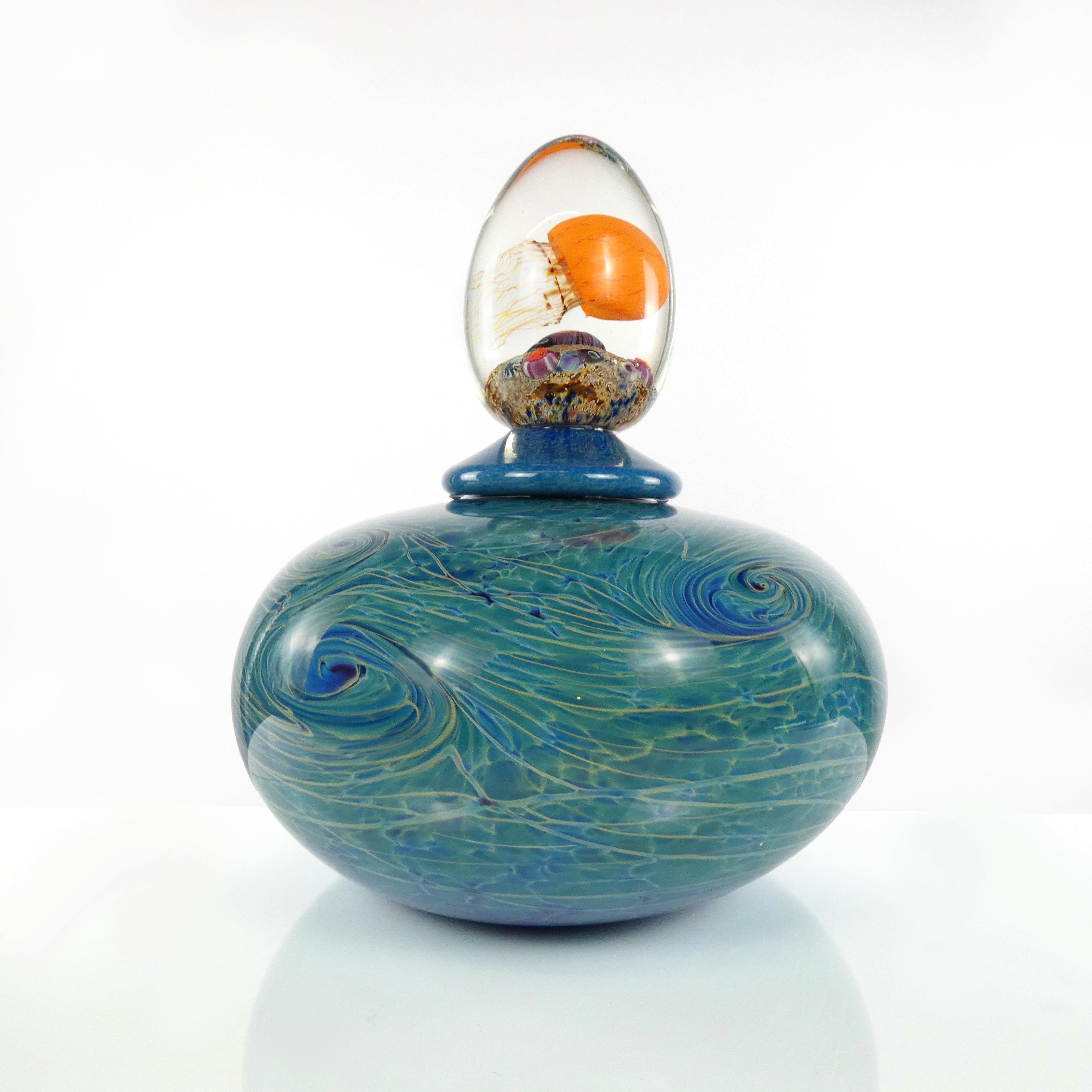 A beautiful sapphire flaked and spiraled background giving the illusion of sea waves, with a vibrant Pacific Jellyfish suspended in clear glass for a surreal lid topper.