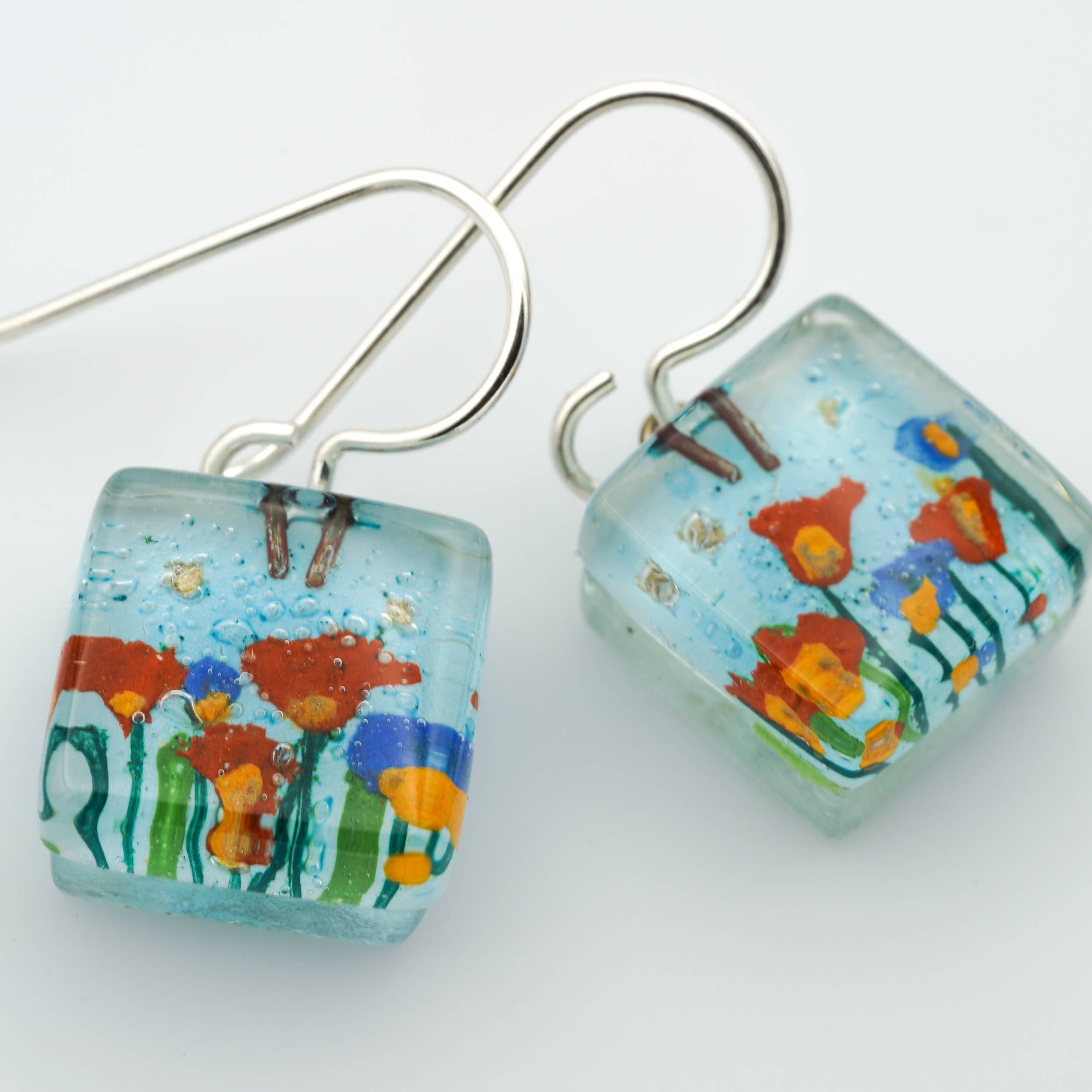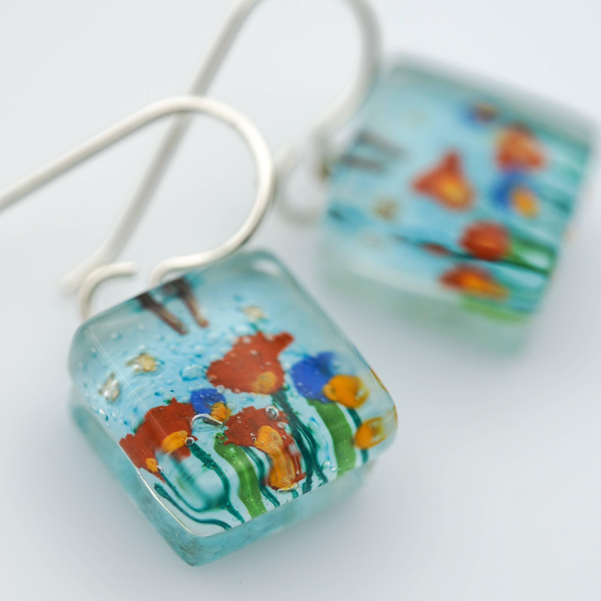 Part of the VERDANT collection — a celebration of Spring and Summer. The ear wires are argentium silver (nickel-free, slow tarnish) and come with silicone ear backs included. Earring card optional. Spinner lips on card optional. (please note that slight variations from the photographed item are inevitable due to the nature of this work -- each design is hand-painted onto the glass)